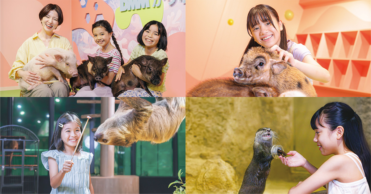 DMMかりゆし水族館は、水辺の生きものだけではなく、ナマケモノやカワウソなどの動物たちに会えるのも特徴です。餌やり体験では、カワウソにタッチすることもできます。